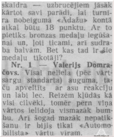 Ielauzies sāncenšu soda laukumā, ar elegantu āķa metienu bumbu uz grozu raida B. Drake. šoreiz tas ir par mata tiesu neveiksmīgs, un notiek sīva cīņa par atlecošo bumbu. Pēc tās tiecas J. Krūmiņš un J. Dāvids. Eglīti no groza cenšas atbloķēt aizsargs J. Merksons. Taču, kamēr giganti cīnās savā starpā, manīgāks izrādās O. Jurgensons. Augstā lēcienā viņš pamanās satvert bumbu, un tūdaļ sākas ātrais pretuzbrukums. Tālu piespēli pāri visam laukumam saņem C. Ozers, taču pēdējā mirklī zem groza viņu panāk G. Sops. Īsa, asa divcīņa, kurā veiksme tomēr Cezara pusē. Nu laiks uzsākt pozicionālu spēli, kuru vada M. Valdmanis. Tiek mēģinātās kombinācijas, bloki, viltīgas piespēles, taču pretinieku aizsardzība stāv kā mūris. Atliek mēģināt veiksmi ar pustālo metienu. To kārtējo reizi precīzi izpilda V. Muižnieks. Bumba, neskarot stīpu, nošvīkst groza tīkliņā. Atkal neizšķirts. . . Jūs teiksiet ko nu vairs tērzēt par to, kas ir bijis un pagājis? Bija laiks, kad mūsu vīriem piederēja vai visi iespējamie basketbola tituli viņu vidū bija olimpisko spēļu dalībnieki, sudraba medaļu ieguvēji. PSRS čempioni un Eiropas kausa glabātāji bija Rīgas ASK sportisti, valsts izlase bez Latvijas basketbola skolas pārstāvjiem nebija iedomājama. Bet mūsu basketbolisti Krūmiņš, Valdmanis un Muižnieks tika minēti par paraugu tālu aiz republikas robežām. Reiz bija... Tā atceramies senās slavas dienas un nopūšamies kaut atkal reiz redzētu basketbola laukumā kaut ko tamlīdzīgu. . . Bet kādēļ gan jāžēlojas pēc līdzīga, ja varēsiet redzēt to pašu? Iepriekš aprakstītā aina nebūt nav vēstures lappuse vai rakstītāja fantāzijas auglis. Tas ir brīdis no treniņa, kuru LPSR Nopelniem bagātā trenera A Kraukļa vadībā aizvada Latvijas veterānu izlases basketbolisti. Pieminētie turklāt vēl nebūt nav visi, kurus visdrīzākajā laikā varēsim redzēt laukumā. Ar Latvijas basketbola federācijas, tās veterānu komisijas, kolhoza «Ādaži» basketbola draugu, laikraksta «Padomju Jaunatne» redakcijas darbinieku pūlēm Rīgā noorganizēts Baltijas republiku basketbola veterānu turnīrs. Varēsim redzēt draudzīgā sacensībā senos sāncenšus Igaunijas, Lietuvas un Latvijas basketbolistus, kuri sasnieguši vismaz četrdesmit gadu vecumu. Turnīrs notiks «Daugavas» Centrālajā sporta namā sestdien, 30. maijā. Tā sākums pulksten 16.00. Biļetes vēl varot iegādāties.. .