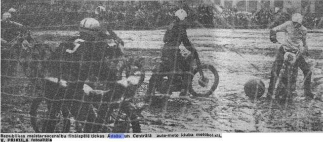 Svētdien VEF stadionā sporta meistare Vizma Rešetnika apsveica Ādažu komandas motobolistus — A. Andiņu, J. Drunku, brāļus A. un V. Zirņus, E. Salmu, P. Libertu. Vizma futbolistiem uz motocikliem pasniedza kausu un balvas par izcīnīto uzvaru pirmajās republikas meistarsacīkstēs. Mūsu republikā motobolu sākušas spēlēt vēl piecas citas komandas, taču tie ir tikai pirmie soļi, un tāpēc Ādažu komandas uzbrucēji trijās spēlēs ieguva 25 vārtus, bet pašu vārtsargs Andiņš neļāva sevi pārspēt ne reizi. Pusfinālā Ādažu motobolisti uzvarēja Tukuma komandu ar 3:1 (0:0). Šajā spēlē divus vārtus guva Vilnis Zirnis un vienus — E. Salms. Otrajā pusfinālā Rīgas automotokluba komandai Cēsīs vajadzēja spēlēt divas reizes. Pirmā spēle pēc pagarinājuma beidzās neizšķirti (1:1). Sestdien otrajā spēlē rīdziniekiem izdevās gūt laimīgu 1:0 uzvaru. Finālā Ādažu kolhoza komandai visneparocīgākais pretinieks bija dubļi. Lielā bumba nepavisam negribēja klausīt, taču jau pirmajā puslaikā komandas kapteinis Agris Zirnis viens pats guva četrus vārtus. Pēc pārtraukuma Agris vēl trīs reizes pārspēja pretinieka vārtu vīru, bet pa reizei arī Vilnis Zirnis un J. Drunka. Rerultāts — 9:0. Pirmo finālspēli vadīja abu veiksmīgāko motobolistu Arņa un Viļņa tēvs — Edgars Zirnis.